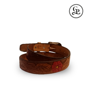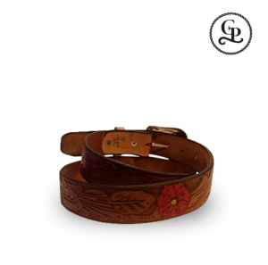 Cinturón para dama cuero grabado Rosa roja color miel