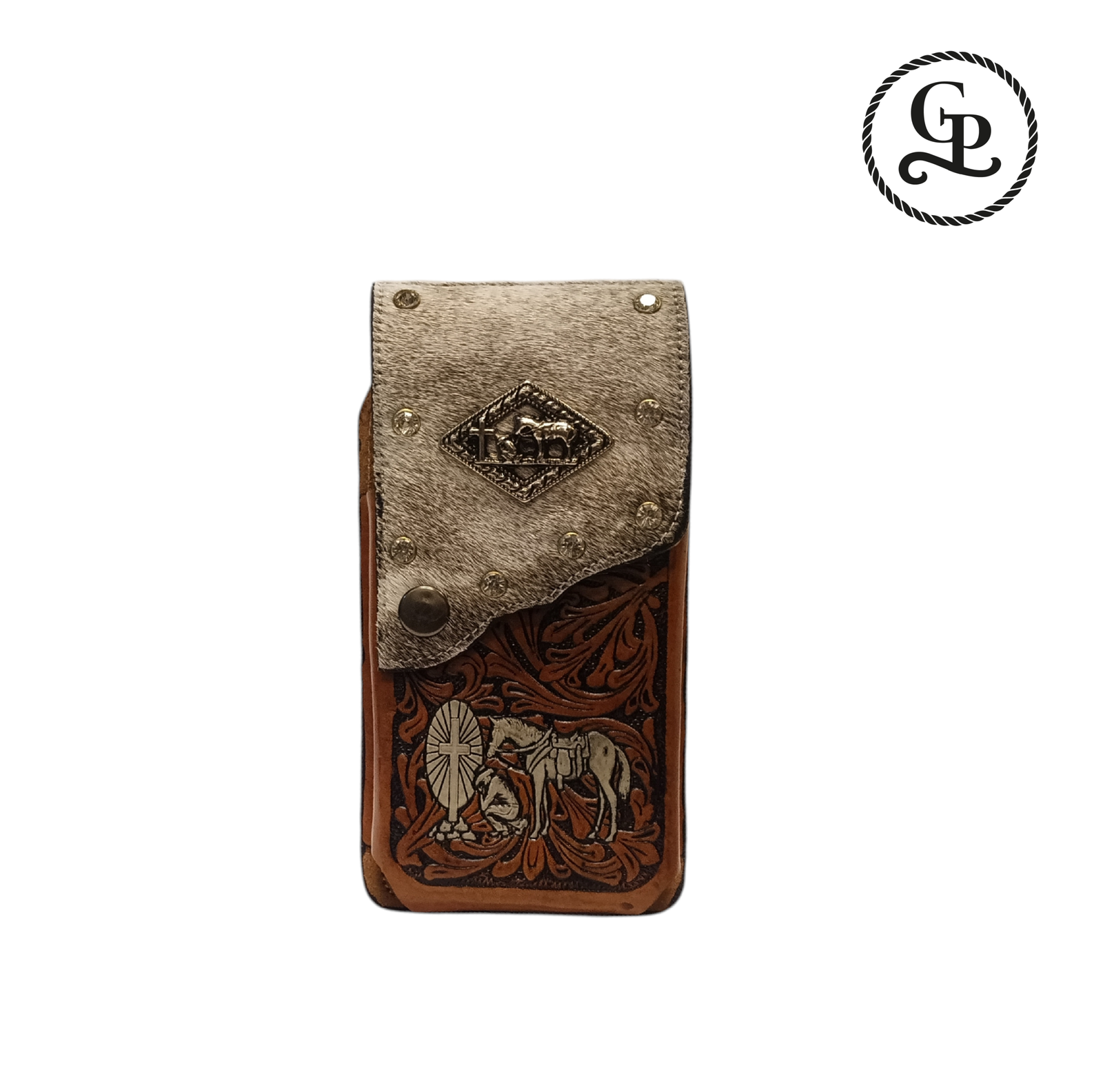 El portacelular de pelo cincelado color miel combina estilo y practicidad, convirtiéndose en un accesorio perfecto para quienes buscan tener a mano su dispositivo móvil con un toque de elegancia.